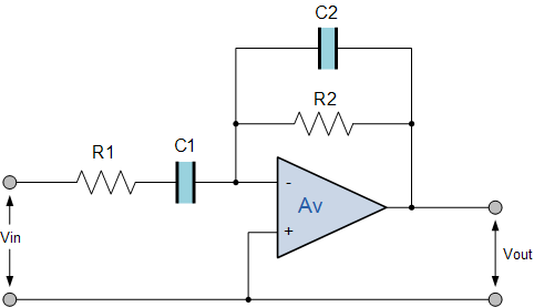 Av=−R1R2 Bandwidth = f2−f1 f2=2πC2R21 f1=2πC1R11 fc=FL+FH
