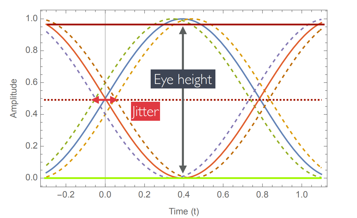 - Eye Width: The distance (in time) between bit switching, typically the inverse of the baud rate. This factor affect the system much less, however you will similarly get errors if .