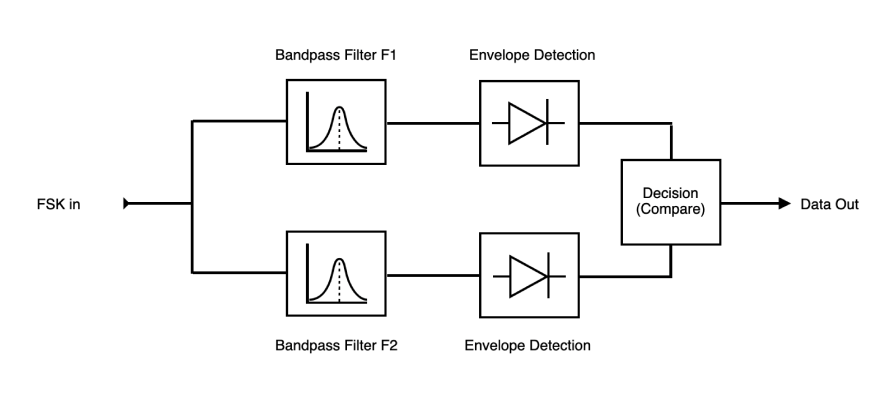 As the name implies, FSK transmits data by keying bits through changes in frequency, it typically does so by switching between different oscillators based on the bit transmitted. Then on the demodulation it passes it through two filters and runs a simple envelope detection to detect bit changes. Finally a comparator compares the two, typically with something simple as