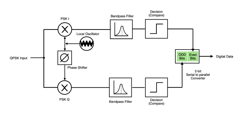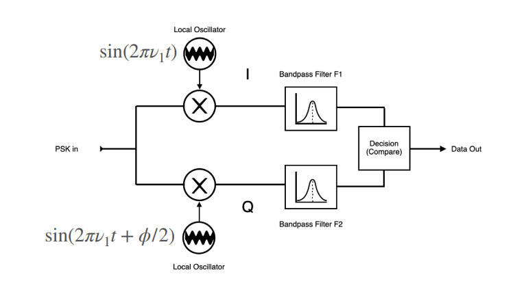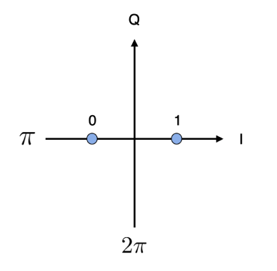 Now in the case of PSK, since both our data points are located along the  axis, and both have , we don’t actually get meaningful data from our Q axis, however this arm will become more important for QPSK