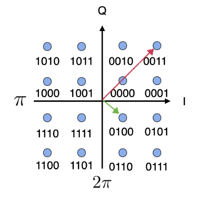 With a very similar transceiver design to QPSK, QAM use IQ modulation to transmit more bits of data per symbol, opting instead of a circle, a matrix of points with spacing for data transmission, making it less error prone, as well as more data efficient, a good example is 16QAM: