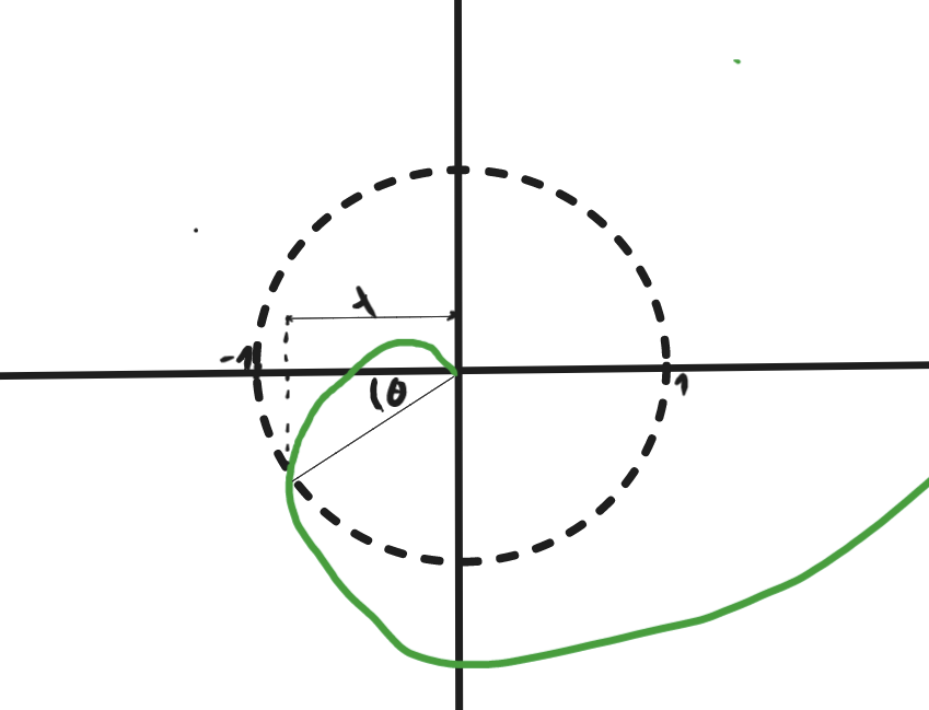 The point rises then, that if we have an equal amount of zeros and poles in the RHP, how do we know stability? This is easily done by checking the stability of the OL TF (), which if it is stable, and there is no encirclements of the point of the plane, we know for a fact our CL is stable. This is called the Nyquist Stability Theorem