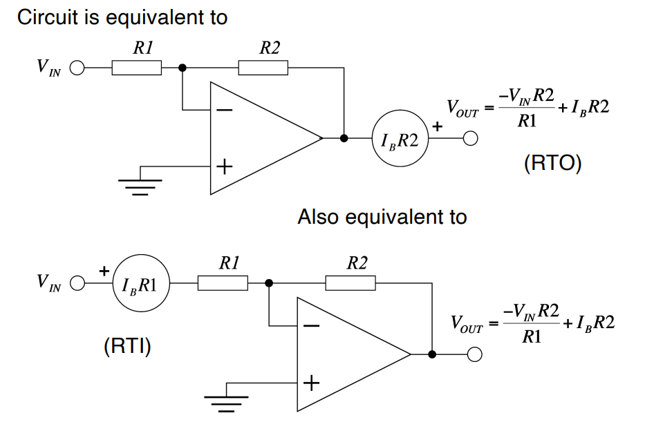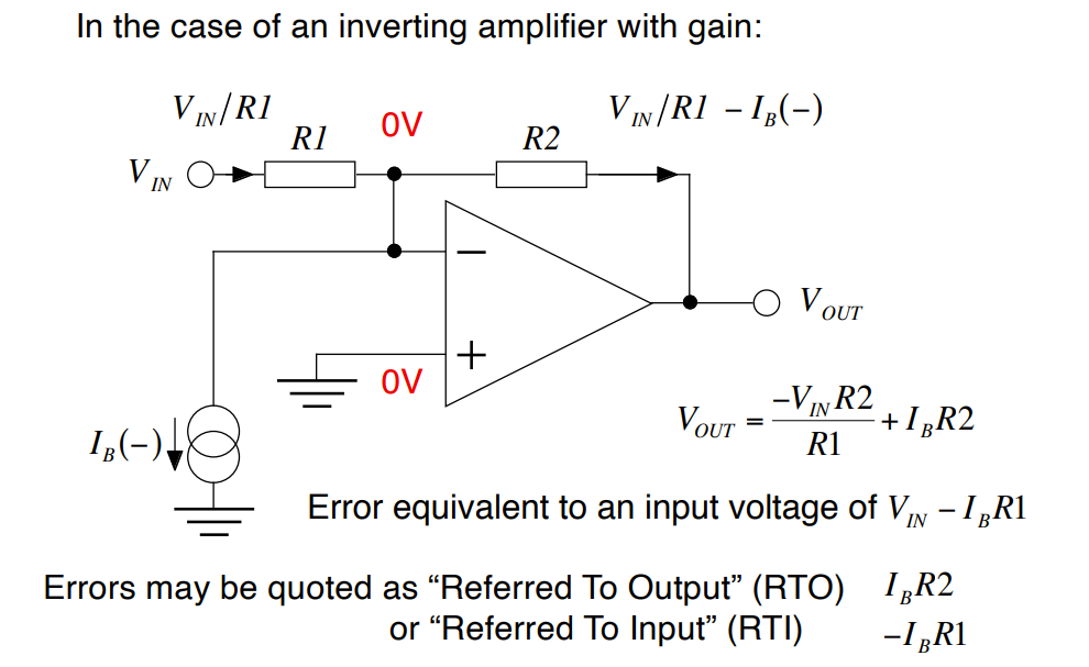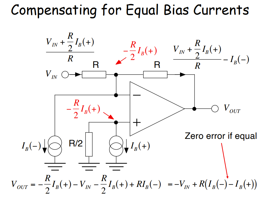 To understand this, we have Left R and Right R, we know that the voltage at the middle node (node -) is - so the voltage through will be Vin - Middle Node, or , note that no current can flow opposite direction through I_B(-) so it is ignored, and no current can flow from the Op-Amp, next, we can calculate the current flow through Right R, which is obviously going to just be the voltage as from before in addition to the which can now have current flow, so therefore it will be (The flow of flows opposite). Finally that means that the voltage out will be