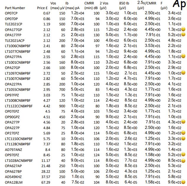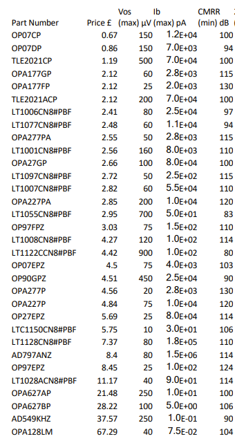 From previous questions you have deduced that your Error Budget is , assuming , In addition to this you have decided on find the best op amp from the following table: