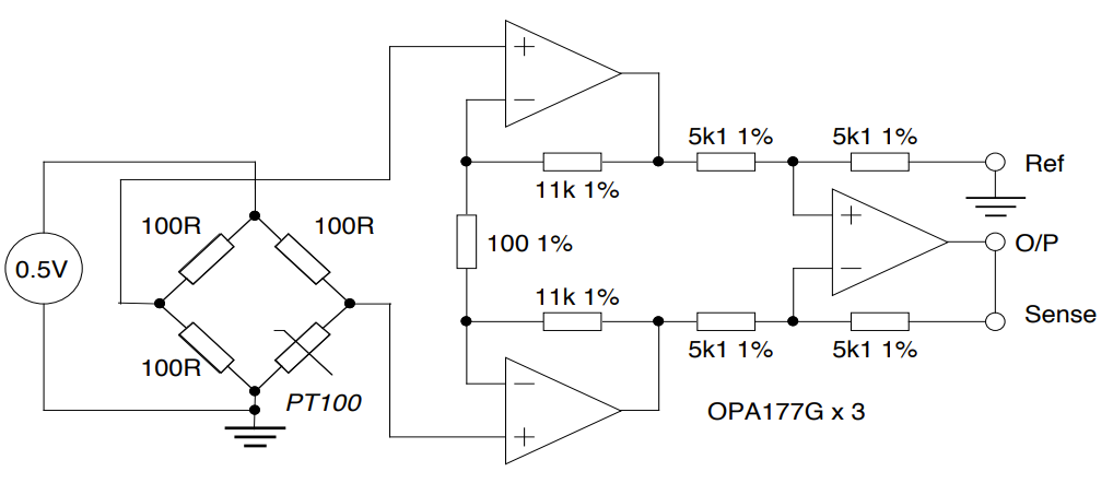 A bridge amplifier is to be constructed to signal condition the output from a platinum resistance thermometer. The platinum resistance thermometer has a resistance proportional to absolute temperature and has a resistance of 100Ω at 0°C. The resistance therefore varies by 0.366Ω / °C near 0°C. Design an instrumentation amplifier to condition the bridge output such that the error due to common-mode rejection is less than 0.05°C. What is the error due to voltage offset in your design?