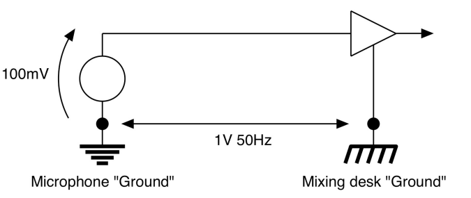 A microphone produces an output of 100mV peak and is input to a mixing desk The ground connection used by the microphone has a 50Hz (Mains) signal of 1V amplitude on it, relative to the ground used by the mixing desk.