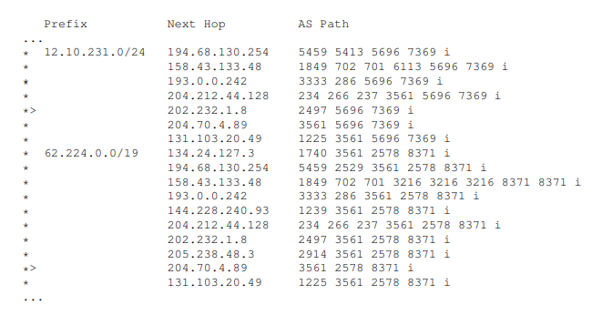 What this means is that for this prefix (ex: 12.10.231.0/24) all of the following paths are valid and take you to the correct final AS (in this case 7369). For all paths, we are listed the full path of ASes that this represents, as well as the “next hop”, which is the corresponding IP address of the first AS in the path.