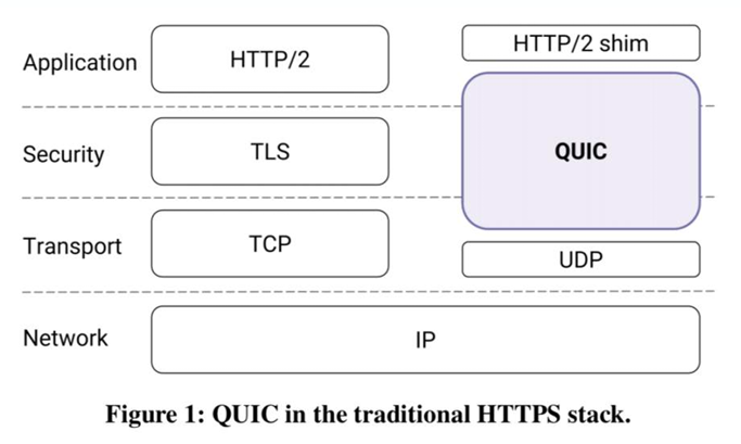 - Protocol Layering: QUIC operates above UDP and combines features traditionally provided by TCP and TLS, including transport and security aspects, and elements from HTTP.