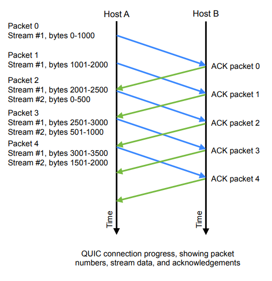 - QUIC packet numbers count packets sent; TCP sequence numbers count bytes of data sent