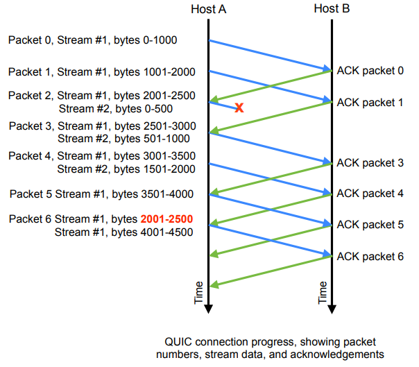 - Packets declared lost after timeout – like TCP QUIC retransmits lost data in new packets