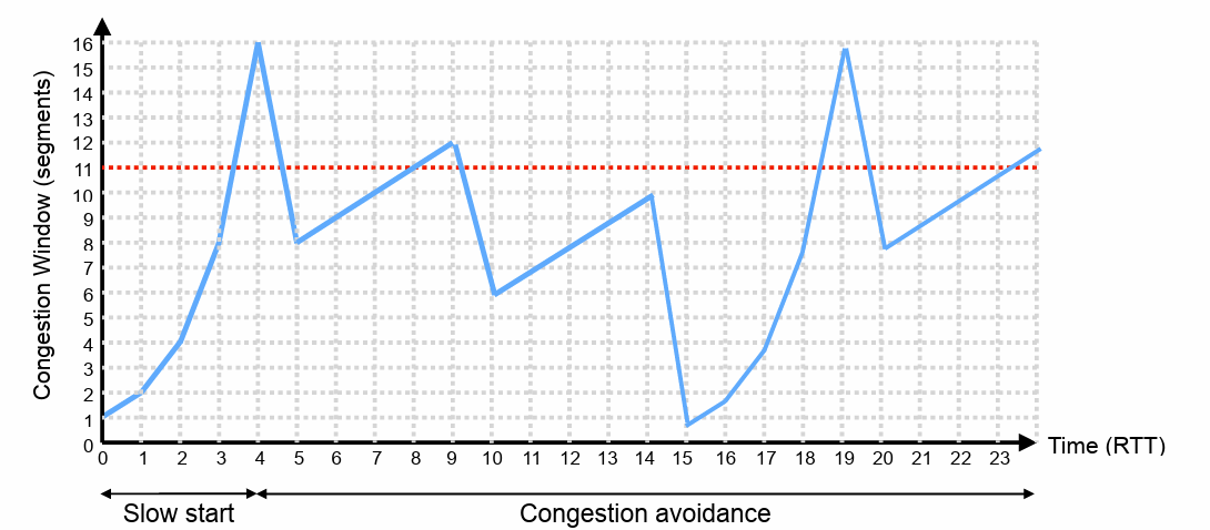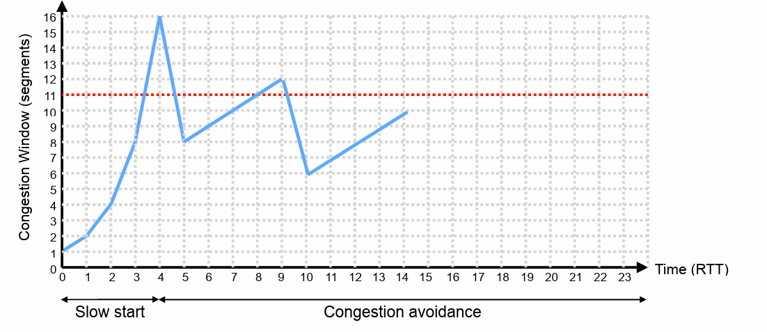 - Increase congestion window by 1 packet per RTT, then send next window worth of packets