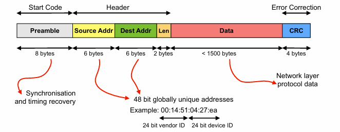 - Destination Address: Where the data is coming from, in the form of 48 bits, 24 bits of vendor ID. and 24 bits of device ID.
