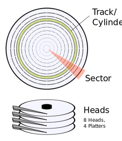 A set of magnetic platters, with two heads per platter (double sided) → Multiple tracks per platter All heads read the same track on different platters, this stack of tracks is referred to as a cylinder. Each block has a: