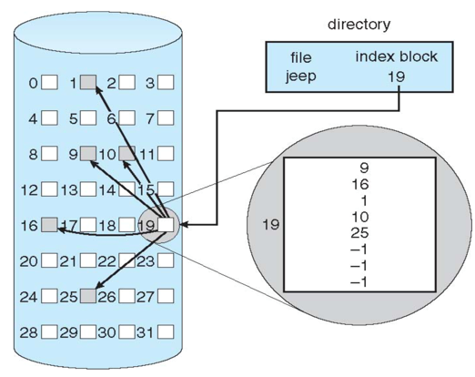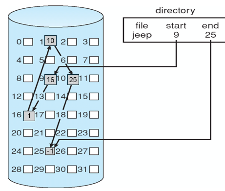 Each file consist of a linked list of blocks Each block contains a pointer to the next This mean each file ends at a (null) pointer