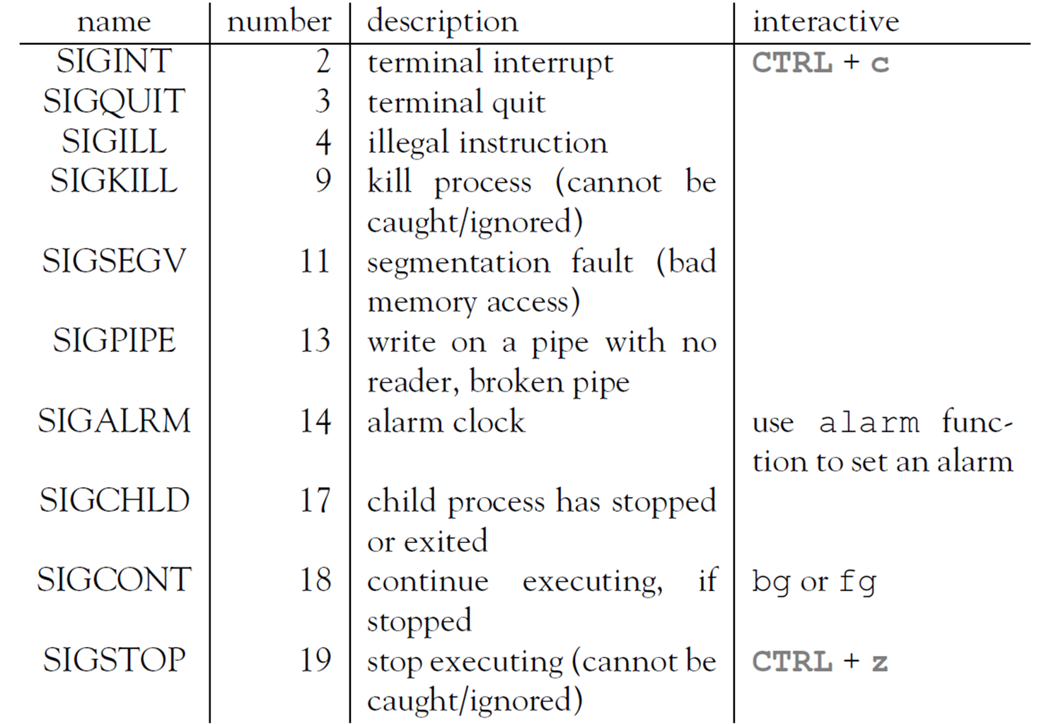 - Signal handler, process registers a handler to respond to events from OS