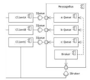 The use of standard interfaces ensures that all messages sent via the bus comply with a prescribed format. This means that every client will know how to parse the structure of a message, even though it may not be able to interpret the content. The figure also shows the internal structure of the MessageBus component. Messages for individual clients are stored in a Queue such that there is one Queue maintained per client. Each queue realises the IQueue interface provided to the appropriate client by the MessageBus. Typically, the client will consume and process messages from the Queue as quickly as it can, using the Queue as a buffer when it experiences a heavy load of messages. The Client will also normally block once it has processed all available messages in its Queue. Separately, clients can send messages using the IBroker interface. This interface is realised by the Broker sub-component. When a message arrives at the interface the Broker decides which Queue the message should be added to, normally, based on the intended end client.