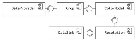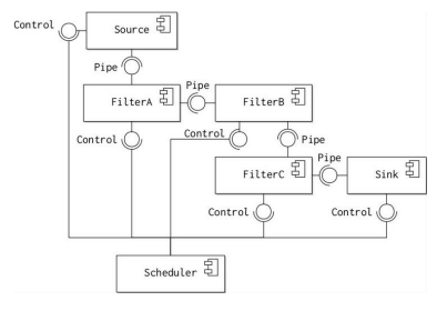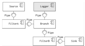 - Two special components bound the pipeline. A data source component provides input on the right and requires the pipe interface. Similarly, a data sink component provides the pipe interface on the right to accept the system’s output on the right.