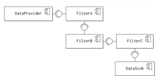 - Each transformation that must be applied to the data is implemented as a single component called a filter. Each filter provides and implements the same interface, sometimes called the pipe. The filters are then wired into a single sequential assembly called the pipeline, with each successive component obtaining data from a component on the left and passing output to the component on the right.