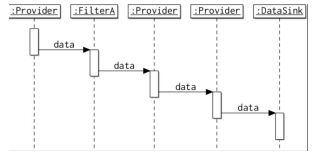 In the push model, data is driven into the system by an active DataProvider, which submits the data to FilterA for processing. The DataProvider will continue to supply data to the filter, until the Filter is blocked by a full buffer. FilterA will process the data and then pass the results on to FilterB. This process continues until the data is written out to a passive DataSink by the last filter.