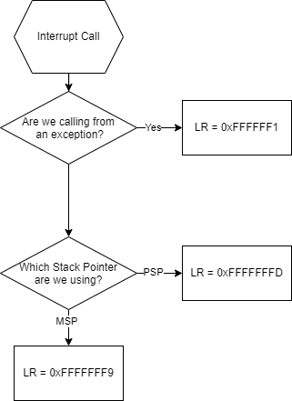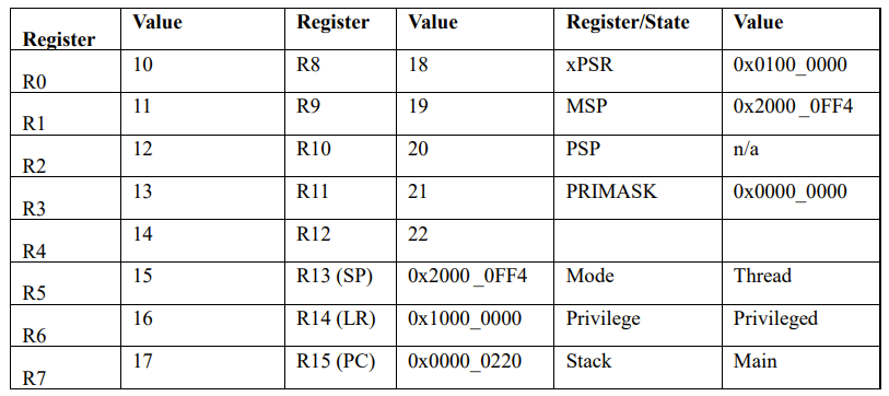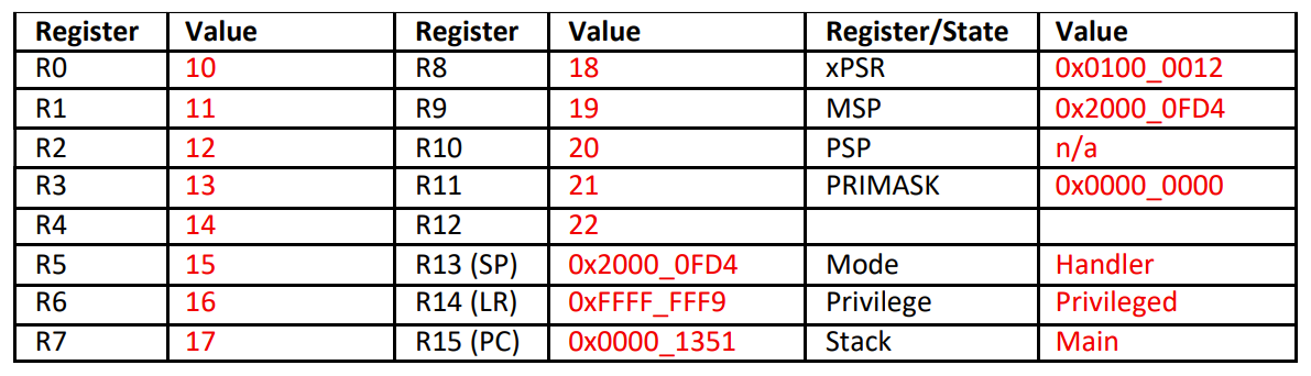 - xPSR = 0x1000_0000 + 0x12 (18 in hex) = 0x1000_0012
