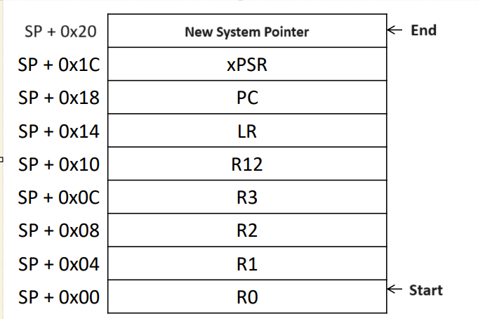 - We load xPSR, PC, LR, R12, R3, R2, R1, R0 onto the stack, and then we update our SP: