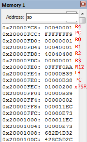 - SP = 0x2000_0FF4 - 0x20 = 0x2000_0FD4