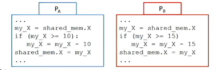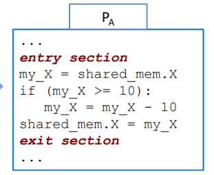 A critical section is a section of code where a process touches shared resources (shared memory, common variables, shared database, shared file, etc)