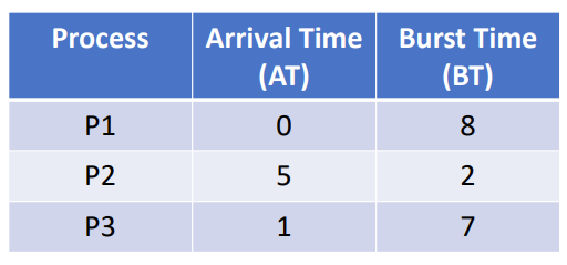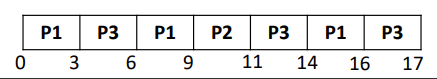 At our only process that has arrived is P1, so we run P1 for 3 At P3 arrives, this means the queue is currently P3 At P1 is taken off the CPU, and placed at the end of the queue, (P1 has 5 left) Queue = P3,P1 So now we run P3 for 3 At P2 arrives, our Queue = P1, P2 At P3 is taken off the CPU, and placed at the end of the queue (P3 has 4 left) Queue = P1,P2,P3 P1 is now run for 3 At P1 is taken off the CPU, and placed at the end of the queue, (P1 has 2 left) Queue = P2,P3,P1 P2 is now run, however the remaining time, 2 is less than so we only run for 2 At P2 is finished, and therefore not placed back on the queue Queue = P3,P1 P3 is now run for 3 At P3 is taken off the CPU, and placed at the end of the queue (P3 has 1 left) Queue = P1,P3 P1 is now run, however the remaining time, 2 is less than so we only run for 2 At P1 is finished, and therefore not placed back on the queue Queue = P3 P3 is now run, however the remaining time, 1 is less than so we only run for 1 At P3 is finished, and therefore not placed back on the queue