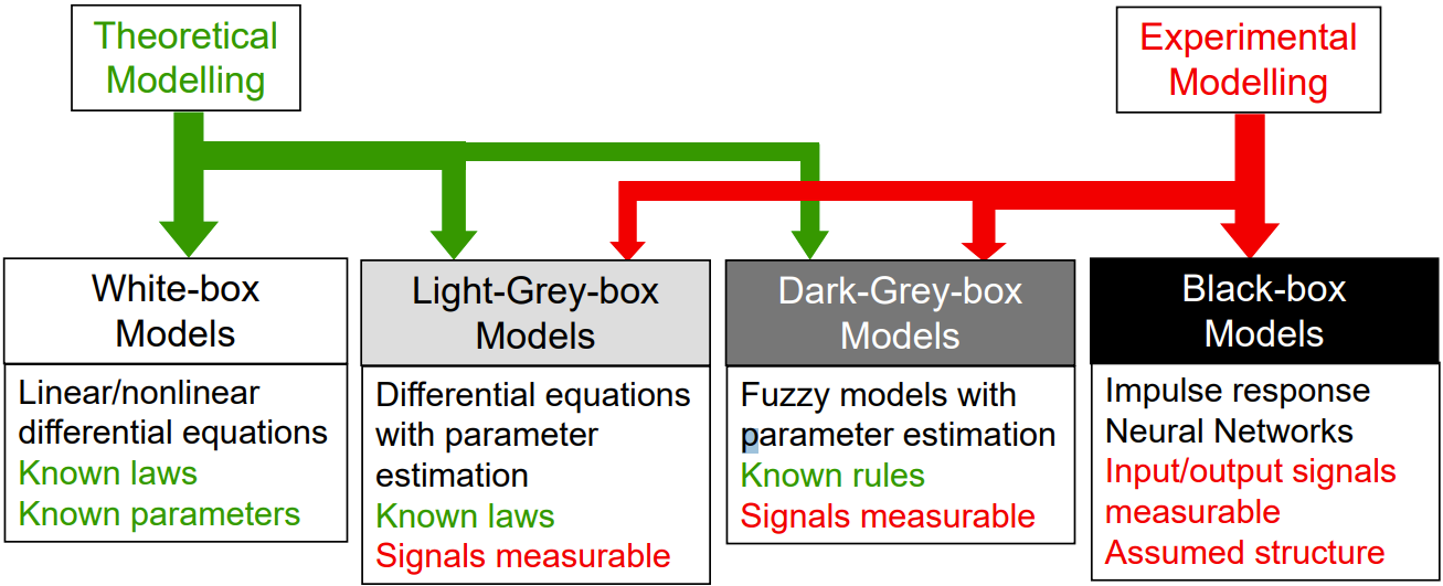 Pure Experimental Modelling leads to Black Box Modelling, which is like Neural Networks, but conceptually only the input and output are measurable, and we have to assume the structure, as we can’t actually decypher the structure.