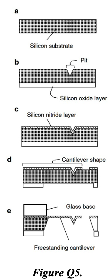 e) The five steps sketched below show snapshots in the process of manufacturing a freestanding AFM Silicon Nitride cantilever. Briefly describe the process necessary to go from a to b, b to c, c to d, and d to e. [8]