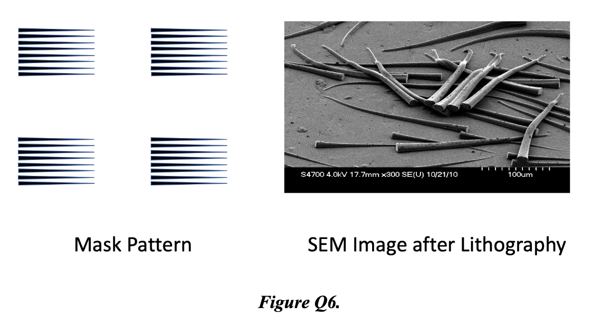 f) Figure Q6 shows a mask pattern and an electron micrograph after the photolithography process. The original pattern consists of tapered lines 15 μm wide (at their widest end) of 200-300 μm length. Describe possible modes of failure of this process, and how this problem may be rectified. [4]