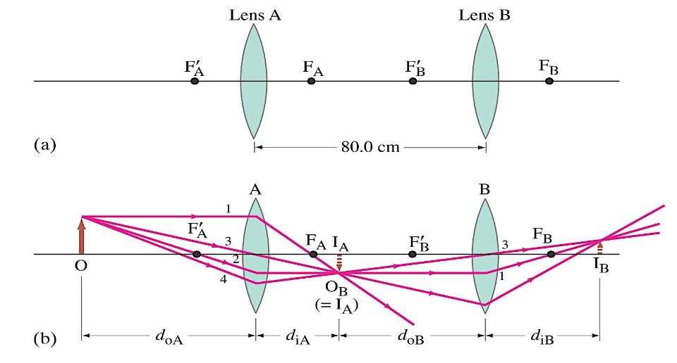 A two-lens system. Two converging lenses, A and B, with focal lengths and , are placed apart. An object is placed in front of the first lens.