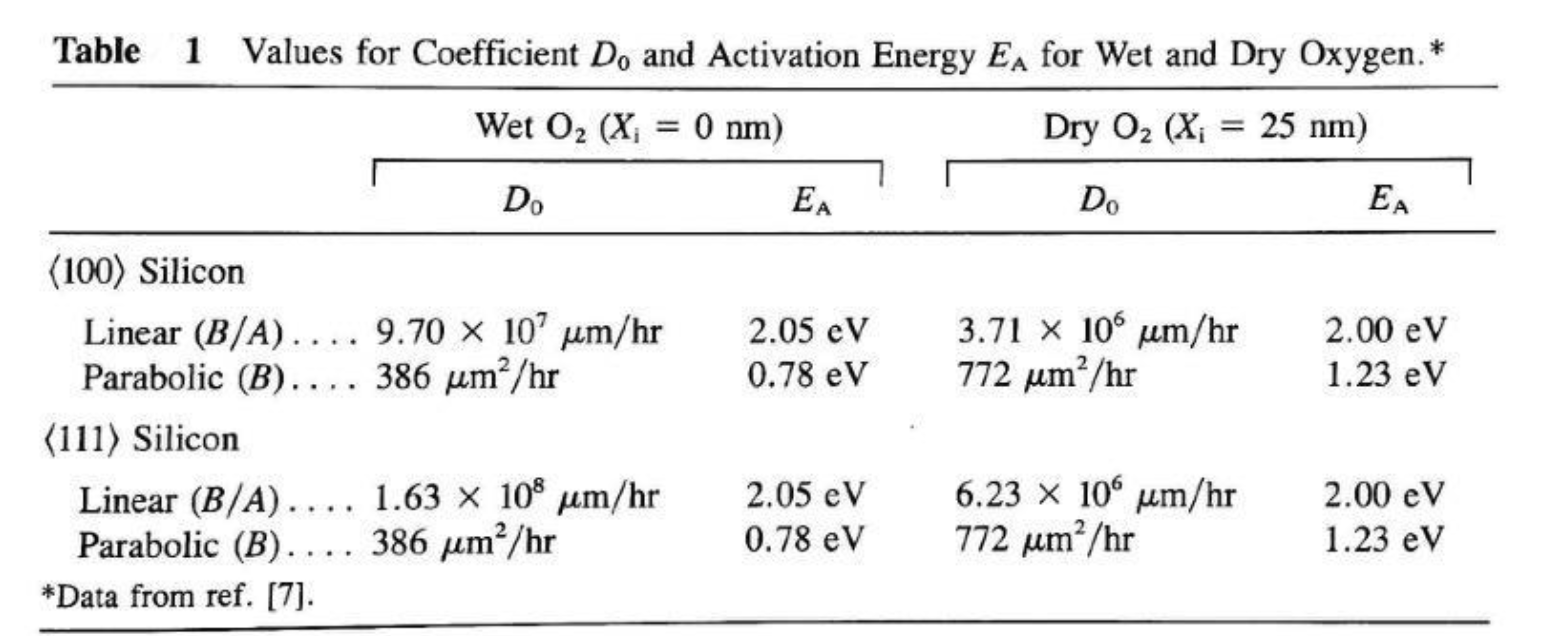 - A ⟨100⟩ silicon wafer is oxidised in dry O₂ at 1000°C for 2 hours. Calculate the oxide thickness grown. Use Table 1 and the Deal-Grove model.