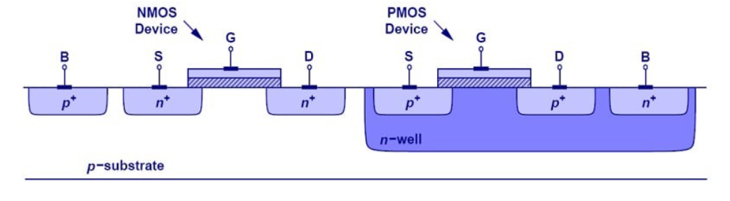 In CMOS, we alternate PMOS and NMOS on a single substrate: