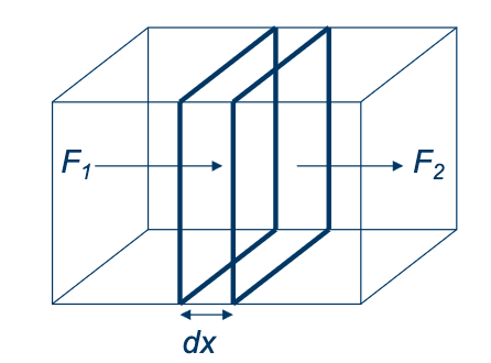 We can say that the flux is proportional to the concentration gradient and atoms move away from regions of high concentration to low concentration. Let us consider the diffusion fluxes in and out of a small volume at position x and thickness dx