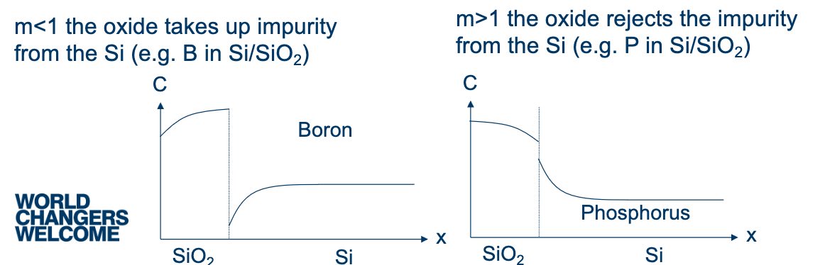 When silicon is thermally oxidised, the growing SiO₂ consumes Si at the interface. Dopant impurities near the surface redistribute between the two materials until equilibrium is reached. The direction depends on the segregation coefficient: