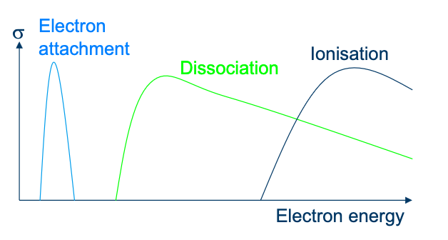 The energy acquired by the molecule in the capture of an electron can cause the molecule to dissociate. For example: Note that one electron goes in and none comes out. It is more difficult to sustain a plasma when the gas has electron affinity.