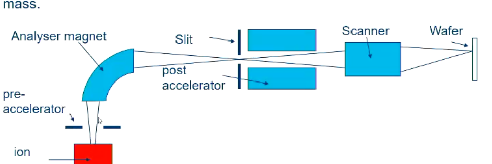 The analyser magnet bends the target ion by 90 degrees. The idea being that ions that are too heavy will bend too slow, overshoot and miss the slit, and the ions that are too light will bend too much, undershoot and miss the slit.