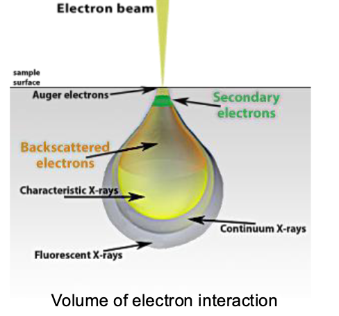 This shows the interaction volume — the teardrop-shaped region beneath the sample surface where an incident electron beam interacts with the material. Different signals originate from different depths within this volume: