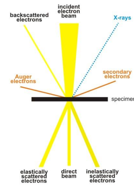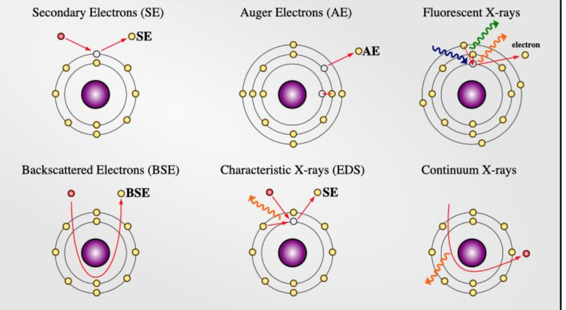 - Secondary electrons — from the very top surface (~few nm). Low energy, easily absorbed, so only the ones generated near the surface escape. Give topographic contrast.