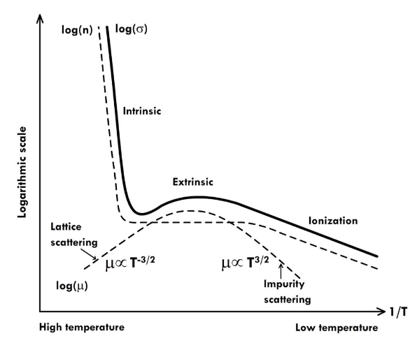 High temperature: mobility decreases with T (μ ∝ T^(-3/2)). Dominated by lattice (phonon) scattering — more phonons are thermally excited at higher T, increasing the scattering rate.
