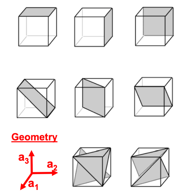 - Plane intercepting a₁=∞, a₂=1, a₃=1 → (011)