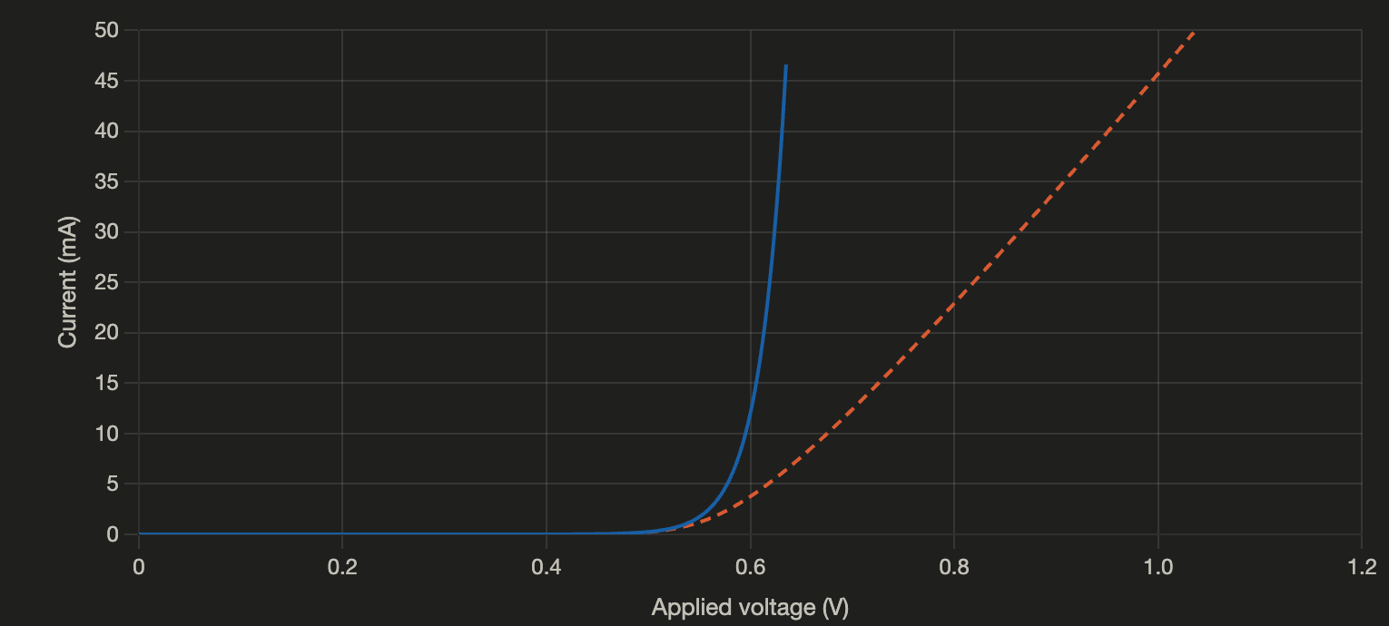 - Sketch forward bias I-V for (a) an ideal diode and (b) a diode with series resistance. Impact on LED/solar cell?