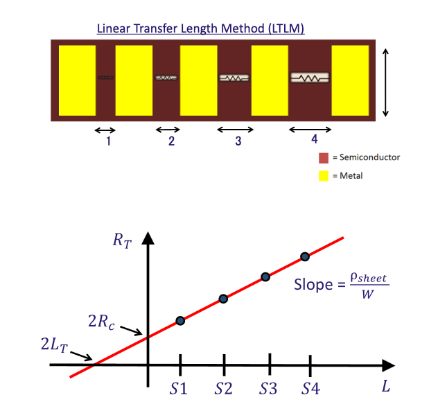This is just the rearrangement of the above — once you extract from the x-intercept of the LTLM plot (resistance vs. contact spacing) and know from the slope, you get .
