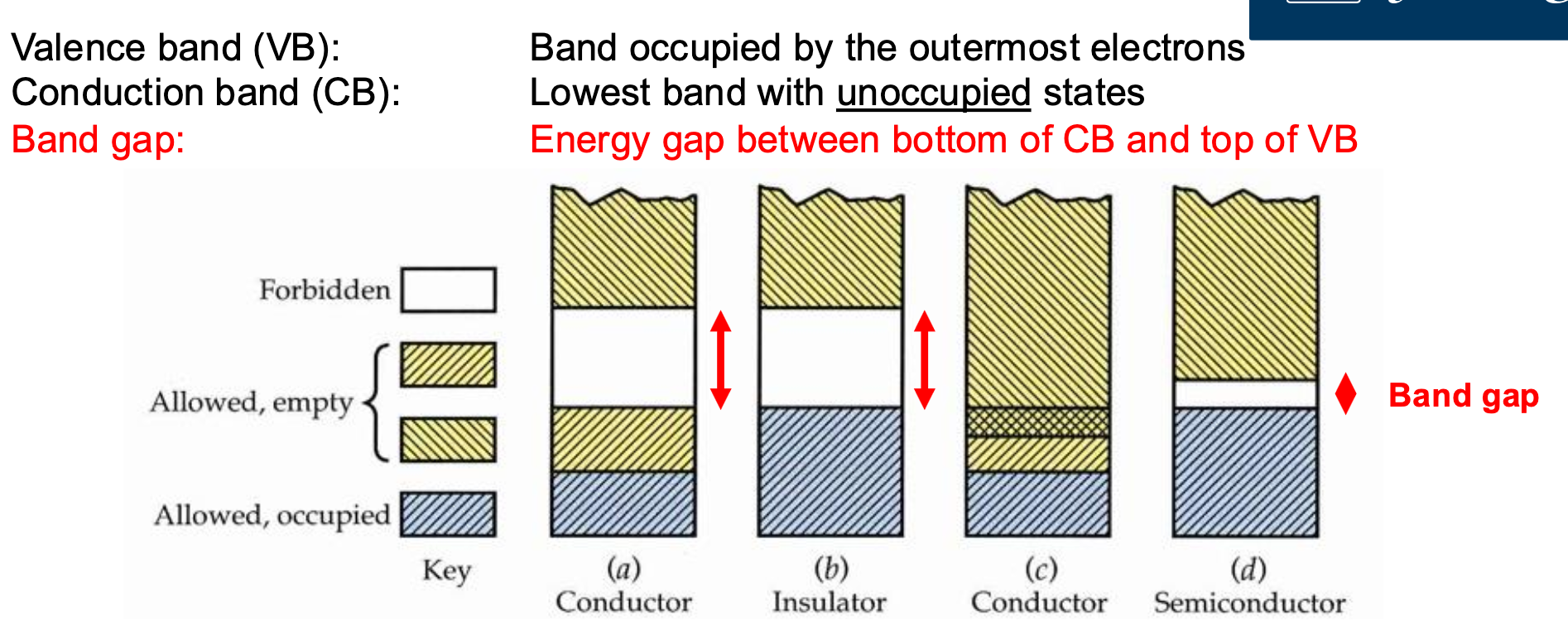 Metals: no band gap, partially filled conduction band, high conductivity, decreases with temperature. Insulators: large band gap (>~4eV), negligible carriers at room temperature. Semiconductors: moderate band gap (~0.5-3eV), conductivity tuneable via doping and temperature, conductivity increases with temperature.