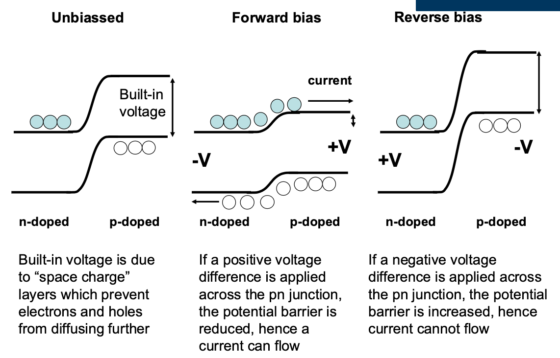 The pn junction acts as a diode: forward bias reduces the barrier → exponential current increase . Reverse bias widens the depletion region → only small leakage current (I₀) flows. I-V characteristic: exponential rise in forward bias, near-zero current in reverse until breakdown.