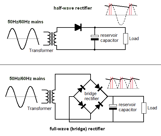 Full-wave: four diodes in a bridge configuration. On each half-cycle, two diodes conduct and two block, routing current through the load in the same direction regardless of input polarity. Output has double the ripple frequency, easier to smooth with a capacitor.