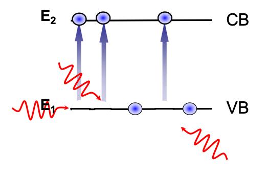 Photons at a energy equal to or above the band gap of a semiconductor can cause an electron in the valence band to be promoted to the conduction band: