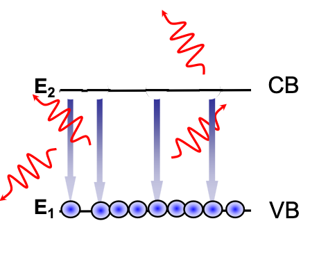 Electrons in the Conduction band can spontaneously lose energy through releasing a photon, and fall to the Valence band: