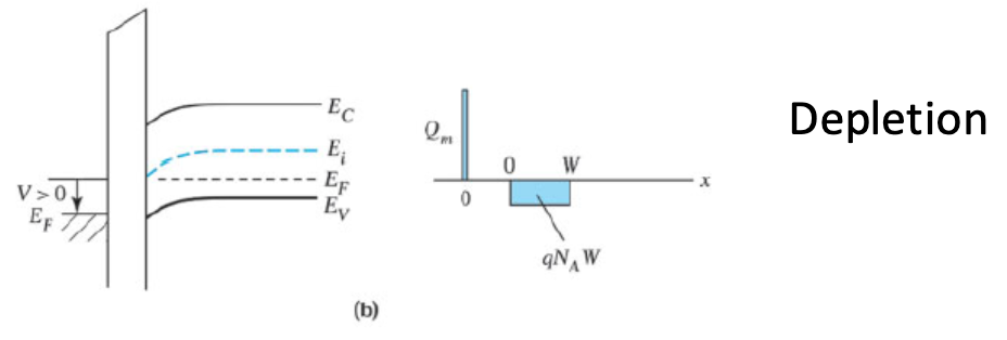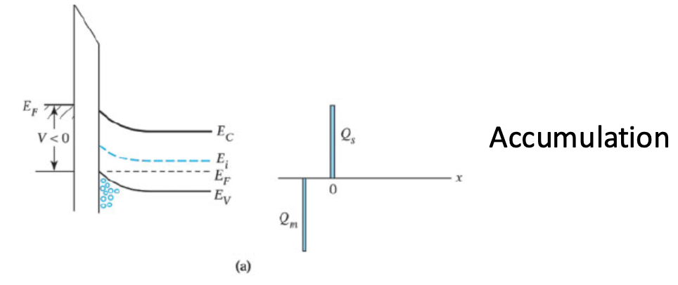 When a negative voltage is applied to the metal plate, excess positive carriers (holes) will be induced at the interface. In this case, the bands near